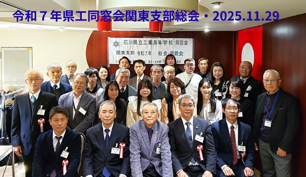 令和7年石川県立工業高等学校同窓会 関東支部の総会・懇親会を東京・中央区「ブラッセリ―東洋」にて開催しました。居村吉記学校長、同窓会本部から戸出克彦会長、河内克彦副会長、竹中義浩局長、山本哲也局員の5名をお迎えし、支部会員22名で総勢27名のご出席となりました。昭和、平成、令和の3代に亘る7名の女性会員のご出席をいただき華やか、賑やかなに懇親会の宴となりました。